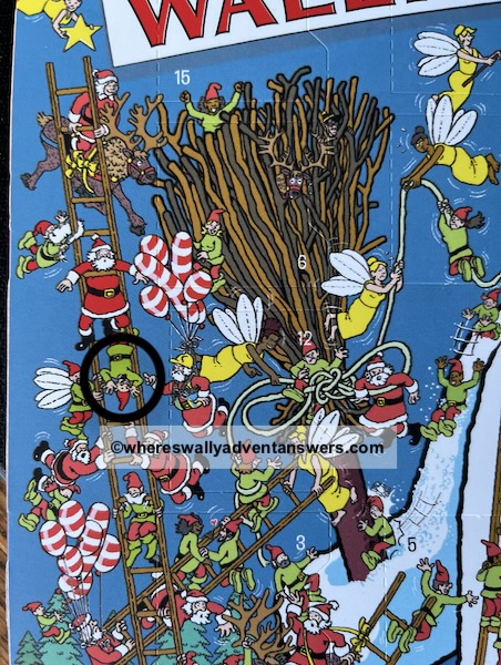 You’ll find this gnome hanging off a rung of the ladder to the left of the giant broomstick, just to the left side of door 12, almost at the edge of the calndar.